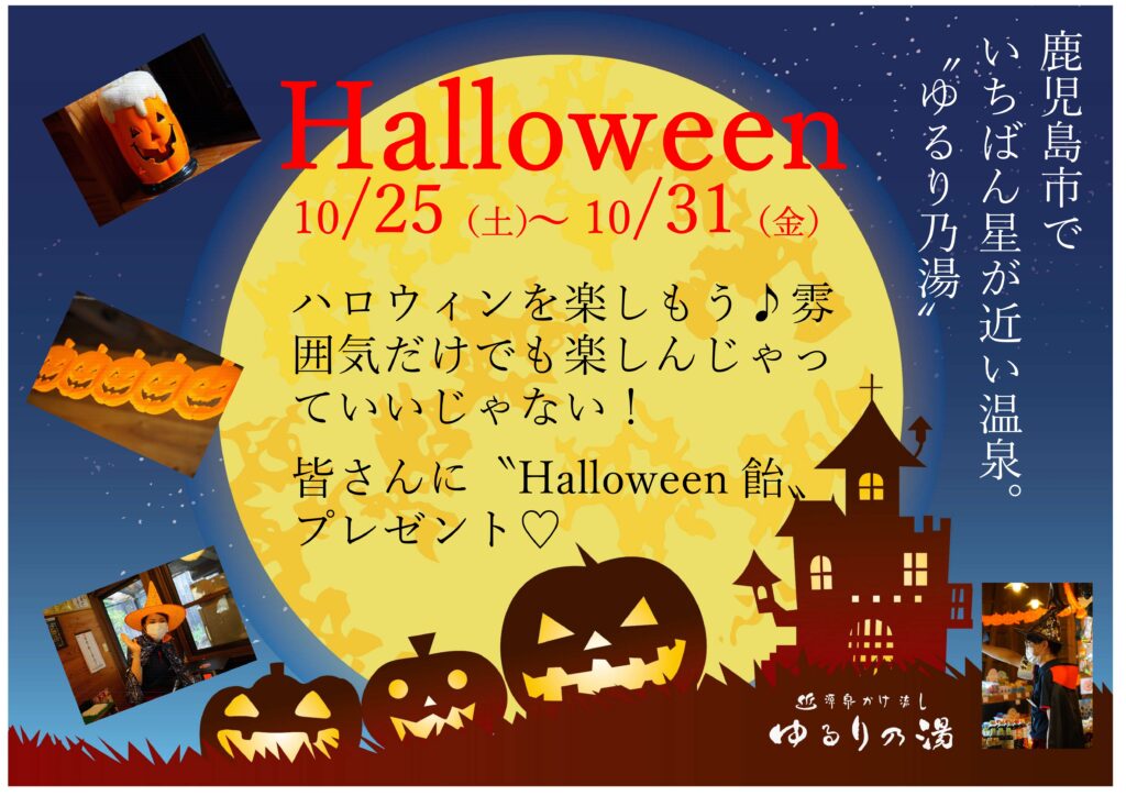 今月末10/31(金)はハロウィンです。ゆるり乃湯では10/25(土)~31(金)まで〝お化け祭り〟を開催中です。良い子のお友達には良いことがあるかもしれませんよ!(笑)それまでも店内はハロウィン仕様です。さぁ、秋の風物詩の一つ〝Halloween〟。気分転換にいかがですか。