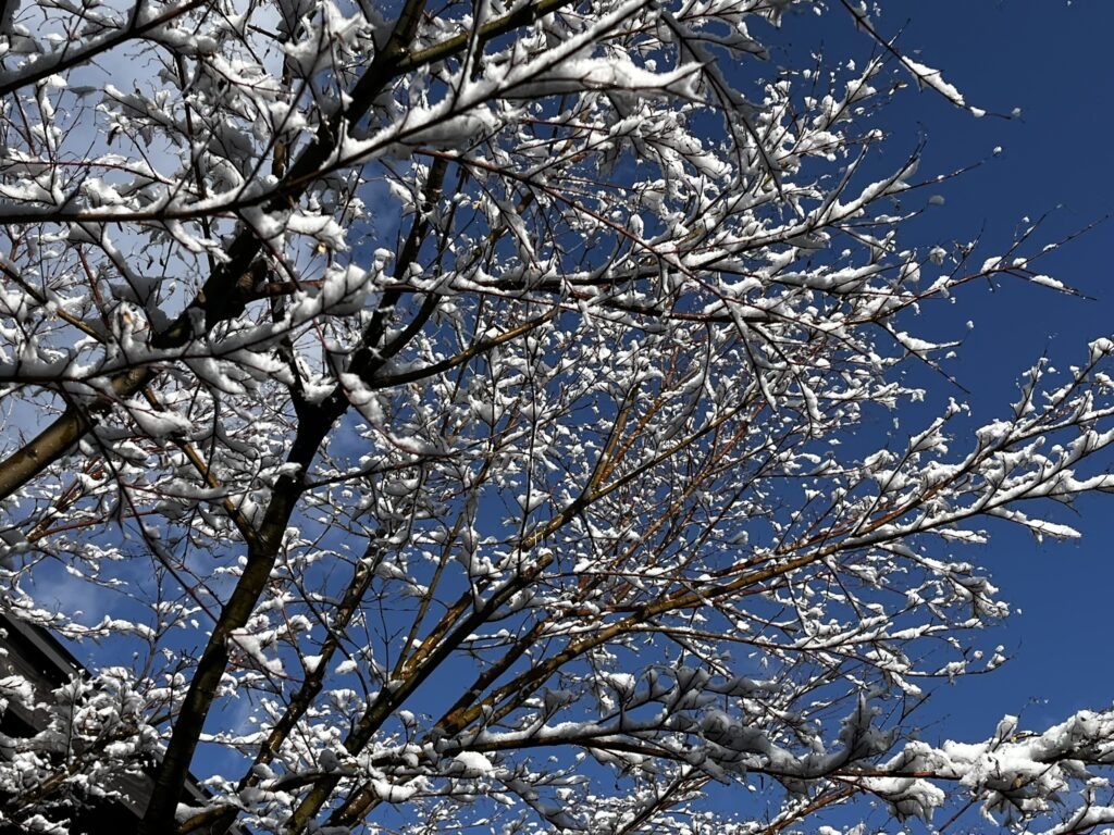 葉の落ちた枝木に雪が積もり〝雪の花〟を咲かせています。