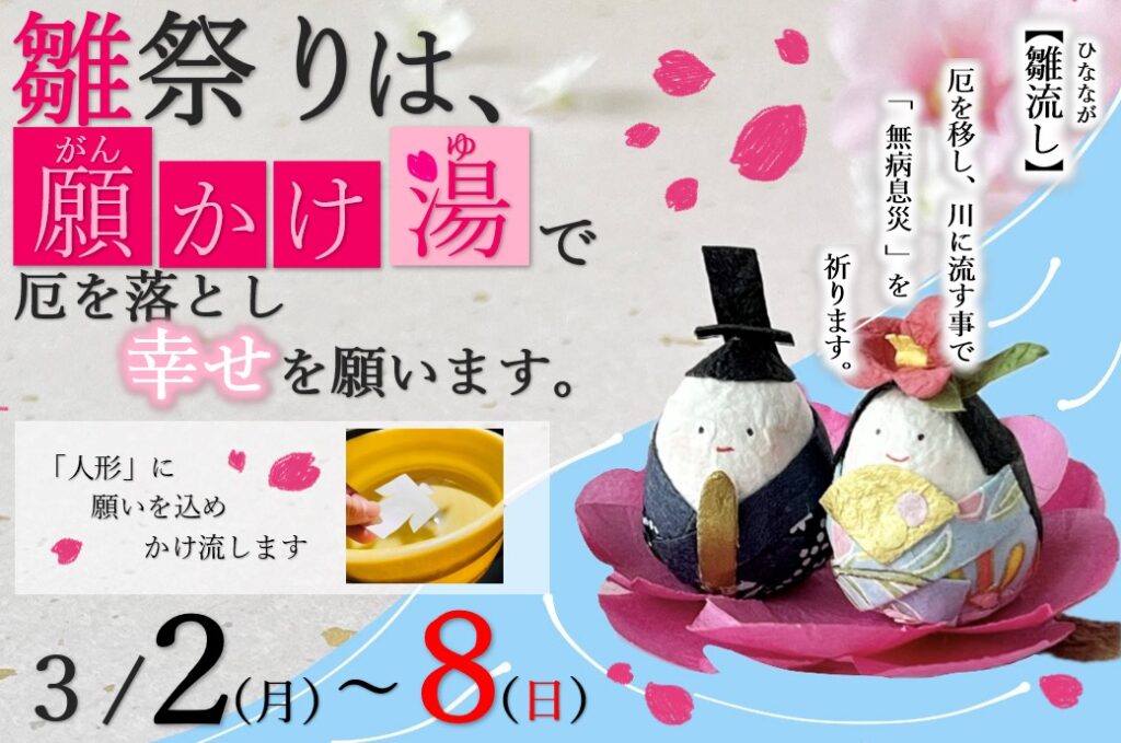 雛流し(ひなながし)は 雛祭りのもとになったといわれる行事です。雛流しに使われる雛人形は「流し雛」と呼ばれます。この雛流し(流し雛)は、子どもの健やかな成長を祈って川に流し、無病息災を祈る古来からの神事です。そこで〝ゆるり乃湯〟はこの古来から伝わる神事(文化)をオリジナルにアレンジした
