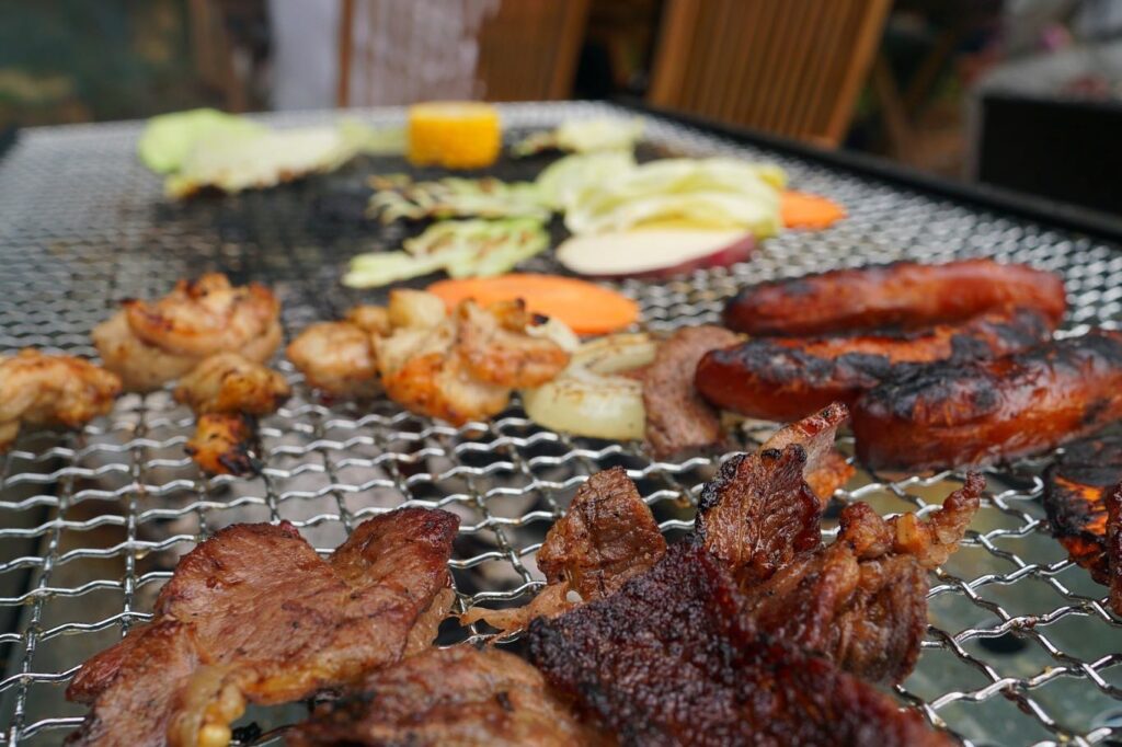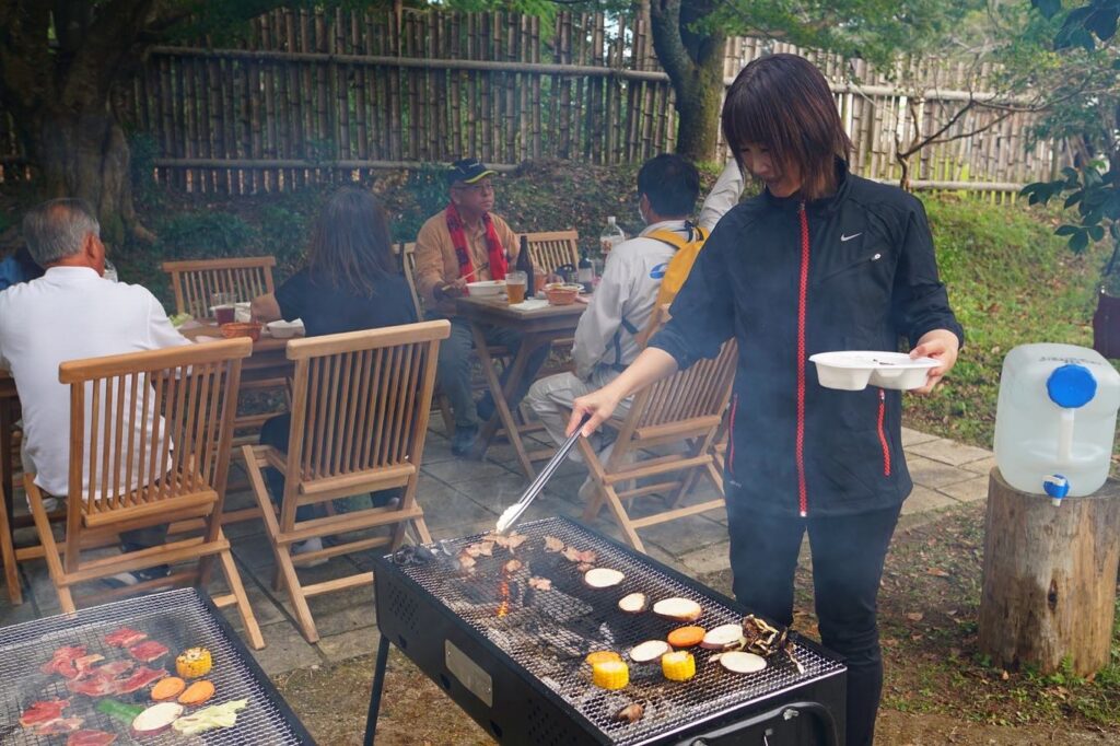 秋風に吹かれ、炭火で焼かれたお肉を屋外で味わう。