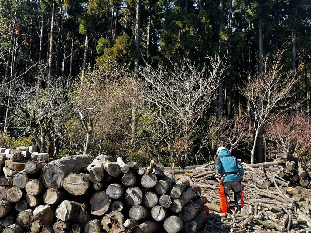 オフシーズンに乾燥させていた丸太を程よい大きさの薪に成形し準備をしておきます。